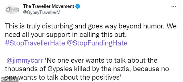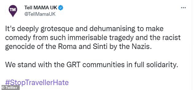 In a tweet referencing the joke, The Traveller Movement - a charity supporting the traveller community in the UK, said: ‘This is truly disturbing and goes way beyond humour. We need all your support in calling this out #StopTravellerHate @StopFundingHate.’