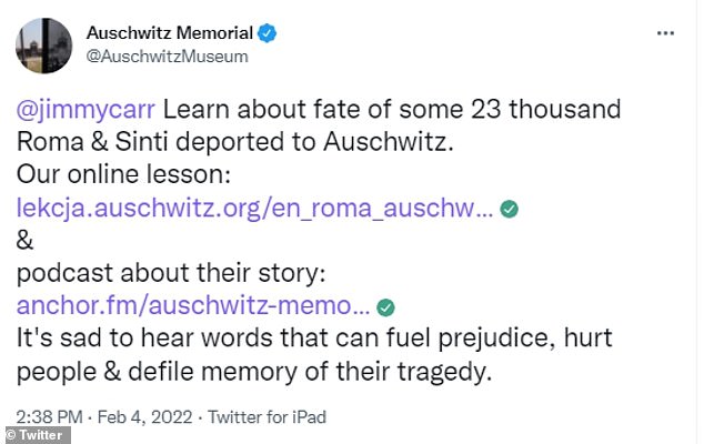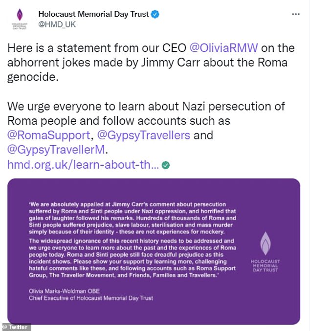 Olivia Marks-Woldman OBE, Chief Executive of Holocaust Memorial Day Trust, added: ‘We are absolutely appalled at Jimmy Carr’s comment about persecution suffered by Roma and Sinti people under Nazi oppression, and horrified that gales of laughter followed his remarks.
