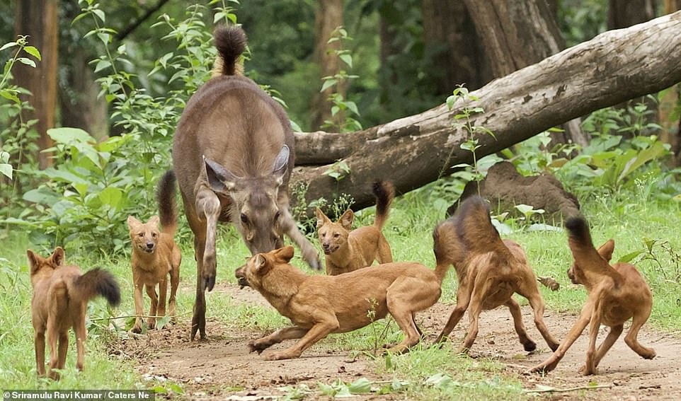 in UK News Photographer captures brave Sambar deer mother trying to fight off pack of dogs attacking her fawn