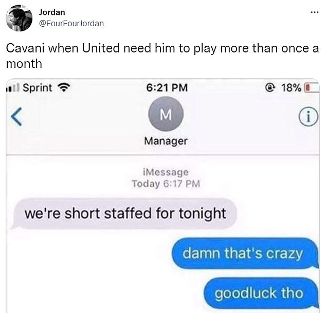 ‘Cavani when United need him to play more than once a month,’ the caption read.