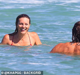 He was seen laughing and joking with the rest of the group, before going for a quick dip in the ocean to cool off.